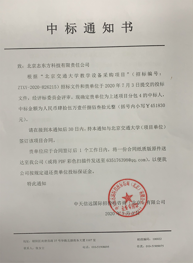 2020年7月,中標(biāo)北京交通大學(xué)教學(xué)設(shè)備采購項目(ZTXY-2020-H26215)分包1、中標(biāo)金額捌拾陸萬零玖佰元整;分包4,中標(biāo)金額肆拾伍萬壹仟捌佰叁拾元整。