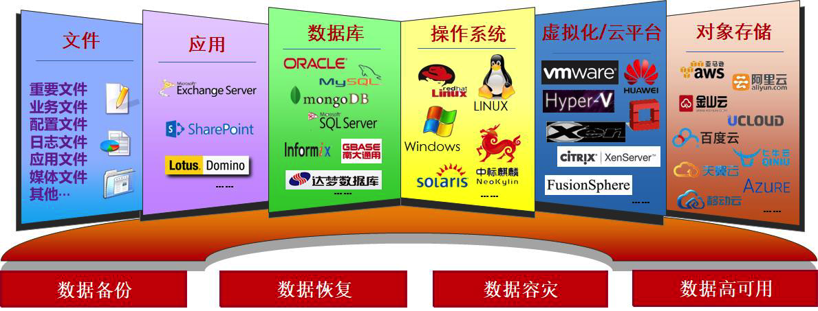 數(shù)據(jù)保護(hù)方案,將數(shù)據(jù)備份系統(tǒng)集合了數(shù)據(jù)備份、數(shù)據(jù)容災(zāi)、數(shù)據(jù)高可用等功能的企業(yè)級數(shù)據(jù)安全保護(hù)平臺,支持多租戶的共享使用,以及本地和云端數(shù)據(jù)的協(xié)同,保護(hù)企業(yè)的操作系統(tǒng)、數(shù)據(jù)庫、應(yīng)用、文件、虛擬機(jī) 、對象存儲 等數(shù)據(jù),