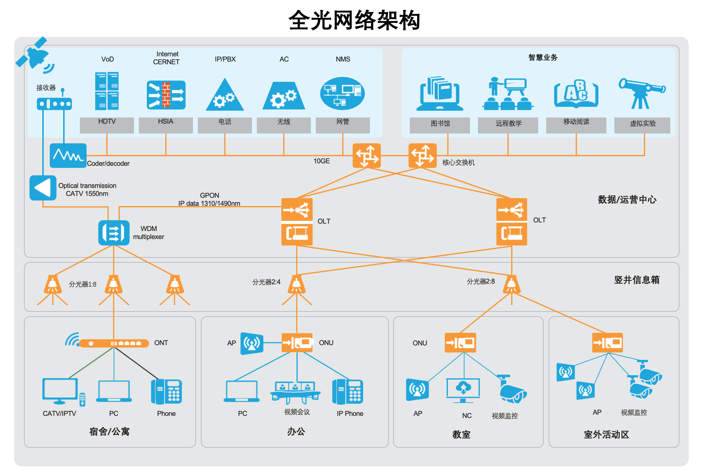 針對目前園區(qū)網(wǎng)普遍存在網(wǎng)絡(luò)架構(gòu)復(fù)雜,安全性可靠性差,運(yùn)維成本高等問題。提出全光網(wǎng)解決方案,有效的解決了園區(qū)網(wǎng)存在的問題,采用無源ODN,POL集中管理的組網(wǎng)方式,具有高可靠性、結(jié)構(gòu)簡單、簡單運(yùn)維,超長線纜壽命構(gòu)建規(guī)劃大帶寬,簡單、易部署的網(wǎng)絡(luò)。