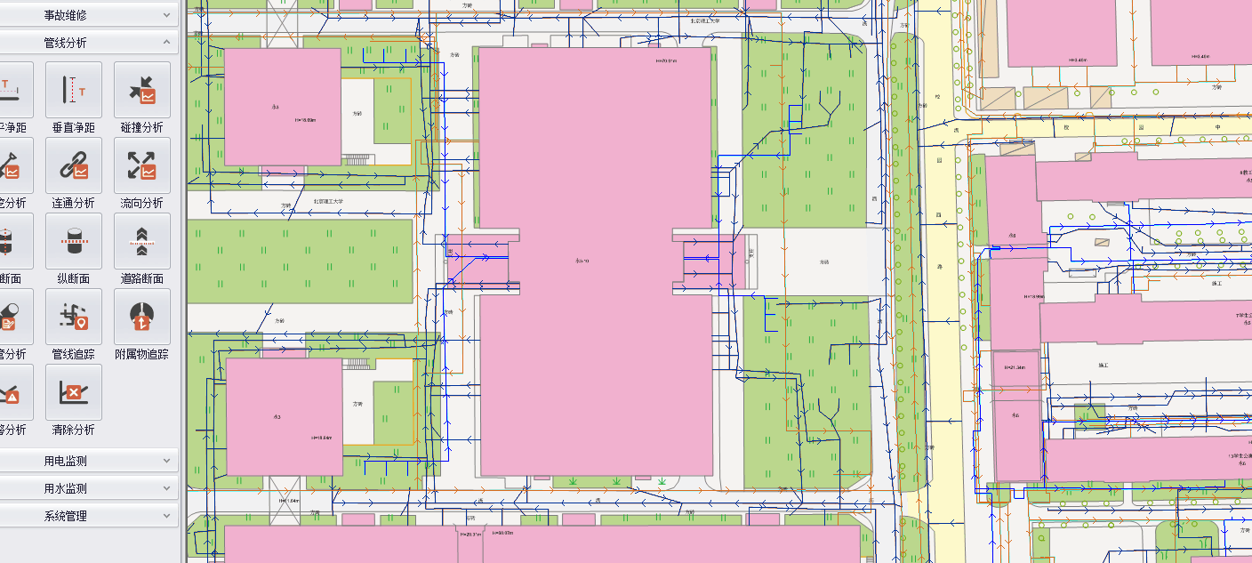 | 室內(nèi)管網(wǎng)分析系統(tǒng):建筑用BIM建模,實現(xiàn)管線地上地下一體化管理,室內(nèi)外一體化管理,還可以在室內(nèi)場景中實現(xiàn)看、查、統(tǒng)計與分析功能。 |